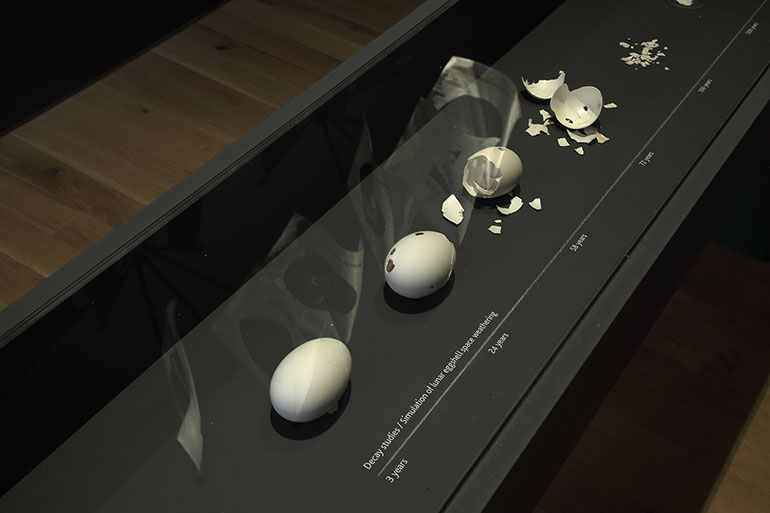 With the help of geologists and impact researchers, the artist follows the logical assumption that although the geese are not present anymore on the moon their remnants - such as droppings and eggs - must be. If we can’t find eggs, where did they go? Disintegrated over hundreds of years, would they show up in chemical analysis of the geological strata of the Moon? This installation presents the documentation and materials of the research, including moon goose eggshells which have been mechanically weathered to simulate lunar conditions.