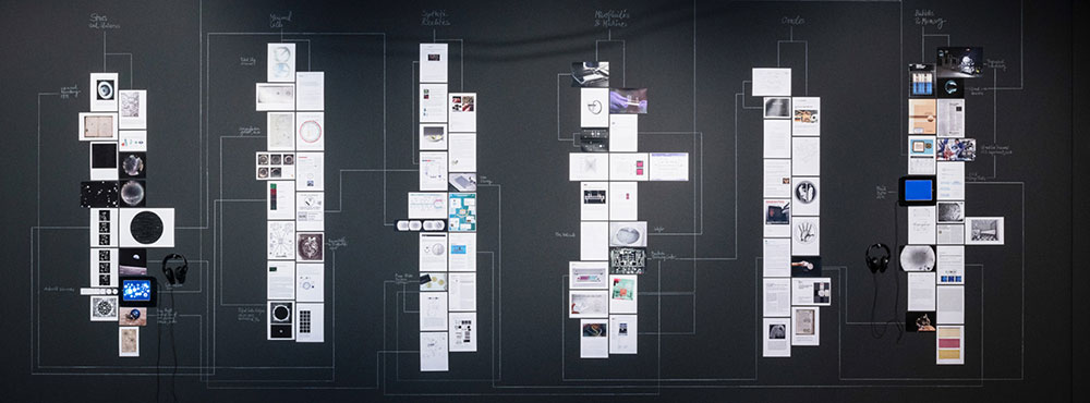 column titles: "Universes & Starrs // Minimal Cells // Synthetic Realities // Microfluidics and Machines // Oracles // Bubble Memories