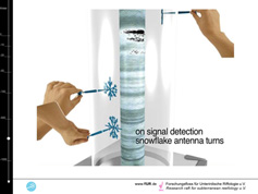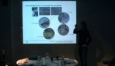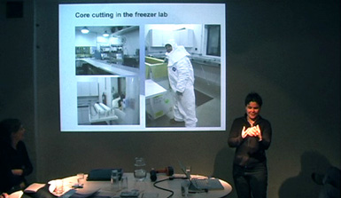 From left to right: Box with ice cores, Helgard Anschütz presenting an ice core , ice borehole (picture source NPI) |