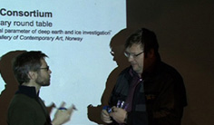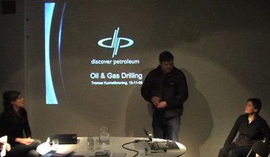 From left to right: Svein Pedersen, director Tromsø kunstforening & talkmaster next to Agnes Meyer-Brandis, location Tromsø Art Gallery, Svein P. talking with Torgeir Bjelvin from oil company Discover |