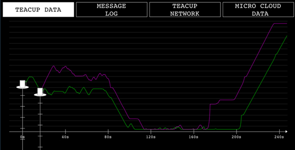 On a mobile phone one can log into the local Teacup Tool Wifi and have a look at realtime curves, written by dancing teacups, listen to Data Tango and get more info on the Global Teacup Network.